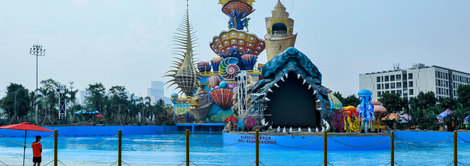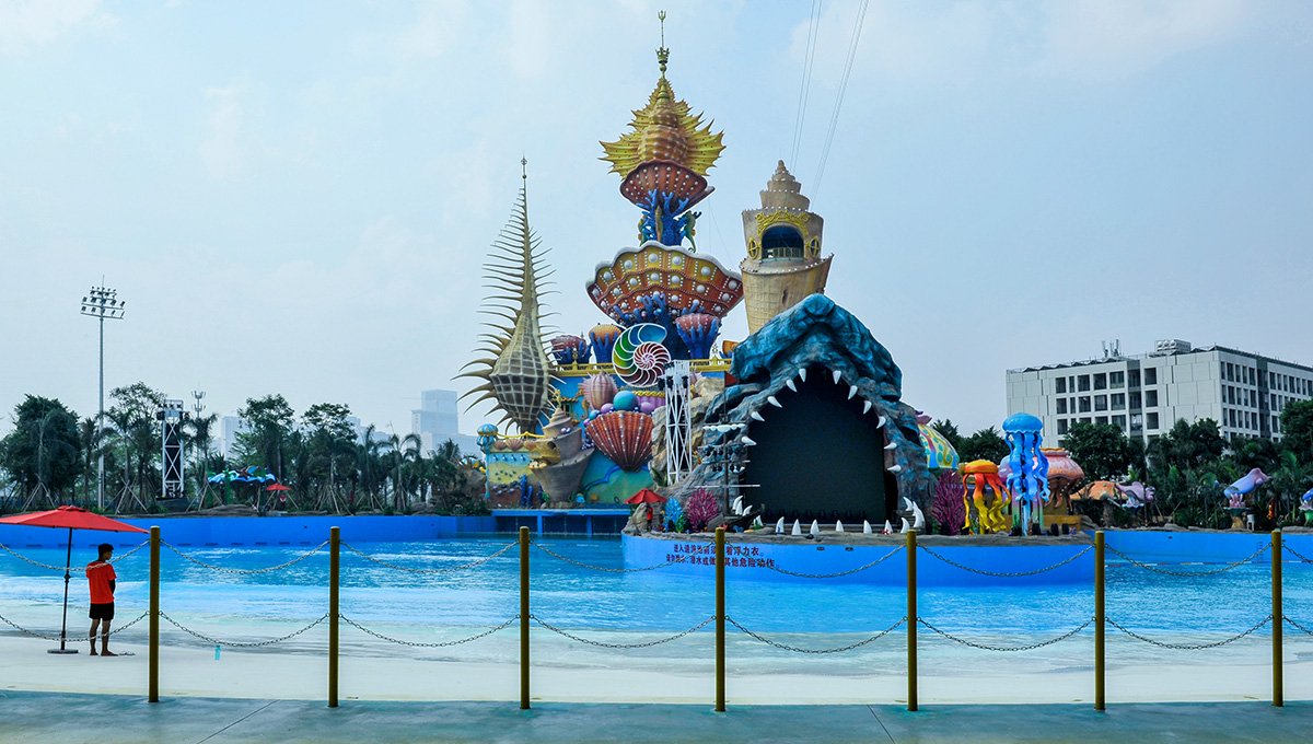 项目包含万人造浪池、漂流河、儿童滑道、潜水池、触摸池、华南最大超级水寨、彩虹滑道、跌浪+大回环滑道、冲浪池、大喇叭组合、黑洞+大碗+管状组合滑道、超长水上过山车、粉色沙滩SPA理疗池等近20项亚洲先进的水上游乐项目。