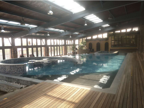 酒店室内恒温泡池采用了混合流循环方式,而室外无边际泳池为顺流式循环方式,水体采用了紫外线高效消毒,并配置了长效氯消毒系统。为确保泳池水质绝对的安全性,泳池监测系统使用了自动水质监测仪,时刻监测水质安全,给泳客们提供一个健康、舒适的水环境。